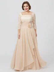 Vestido de madre de la novia con corte tubo/columna, formal, clásico y atemporal, elegante y lujoso, talla grande, escote cuadrado, largo hasta el suelo, gasa, encaje metálico, manga 3/4, sin mangas, con faja/cinta y flores - EE. UU. 2 / Reino Unido 6 / UE 32