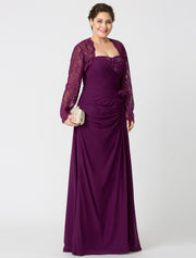 Vestido de madre de la novia de corte tubo/columna, formal, dos piezas, chal incluido, sin tirantes, largo hasta el suelo, gasa, brillo, encaje, sin mangas, sí, con encaje y cuentas