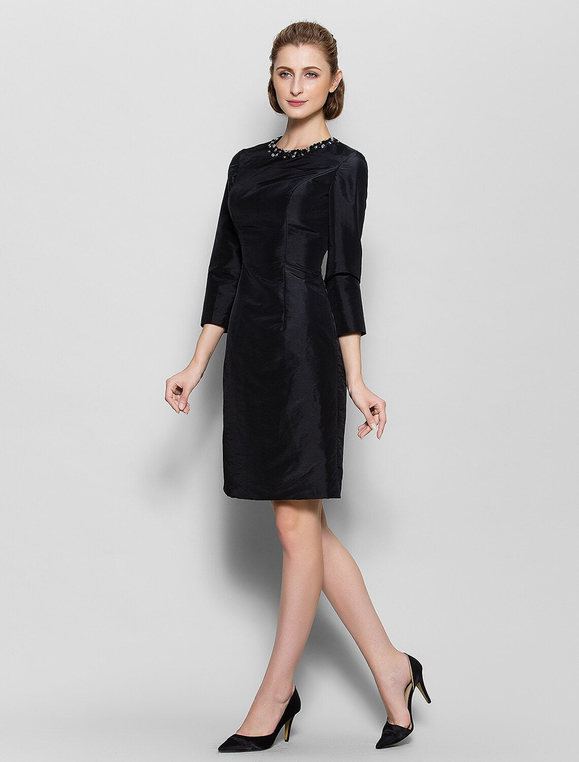 Vestido de madre de la novia con corte tubo/columna, vestido negro corto, escote joya, largo hasta la rodilla, tafetán de nailon, manga 3/4, sin abalorios