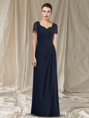 Vestido de madre de la novia con corte tubo/columna, sencillo, elegante, escote en V, largo hasta el suelo, de gasa, manga corta con fruncido.