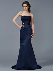 Vestidos largos de satén con cuentas, sin mangas, sin tirantes y corte trompeta/sirena