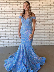 Vestidos de terciopelo con lentejuelas, hombros descubiertos, sin mangas y hasta el suelo, corte trompeta/sirena