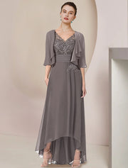 Vestido de dos piezas de corte A para madre de la novia, elegante, formal, para invitada de boda, escote en V alto y bajo, asimétrico, largo hasta la rodilla, de gasa, con encaje, mangas 3/4, cruzado incluido, con apliques fruncidos. - Caqui / EE. UU. 2 / Reino Unido 6 / UE 32