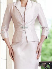 Vestido de dos piezas para madre de la novia, estilo columna/vestido estilo iglesia, elegante, talla grande, cuello joya, largo hasta la rodilla, satén, sin mangas, con cristales fruncidos
