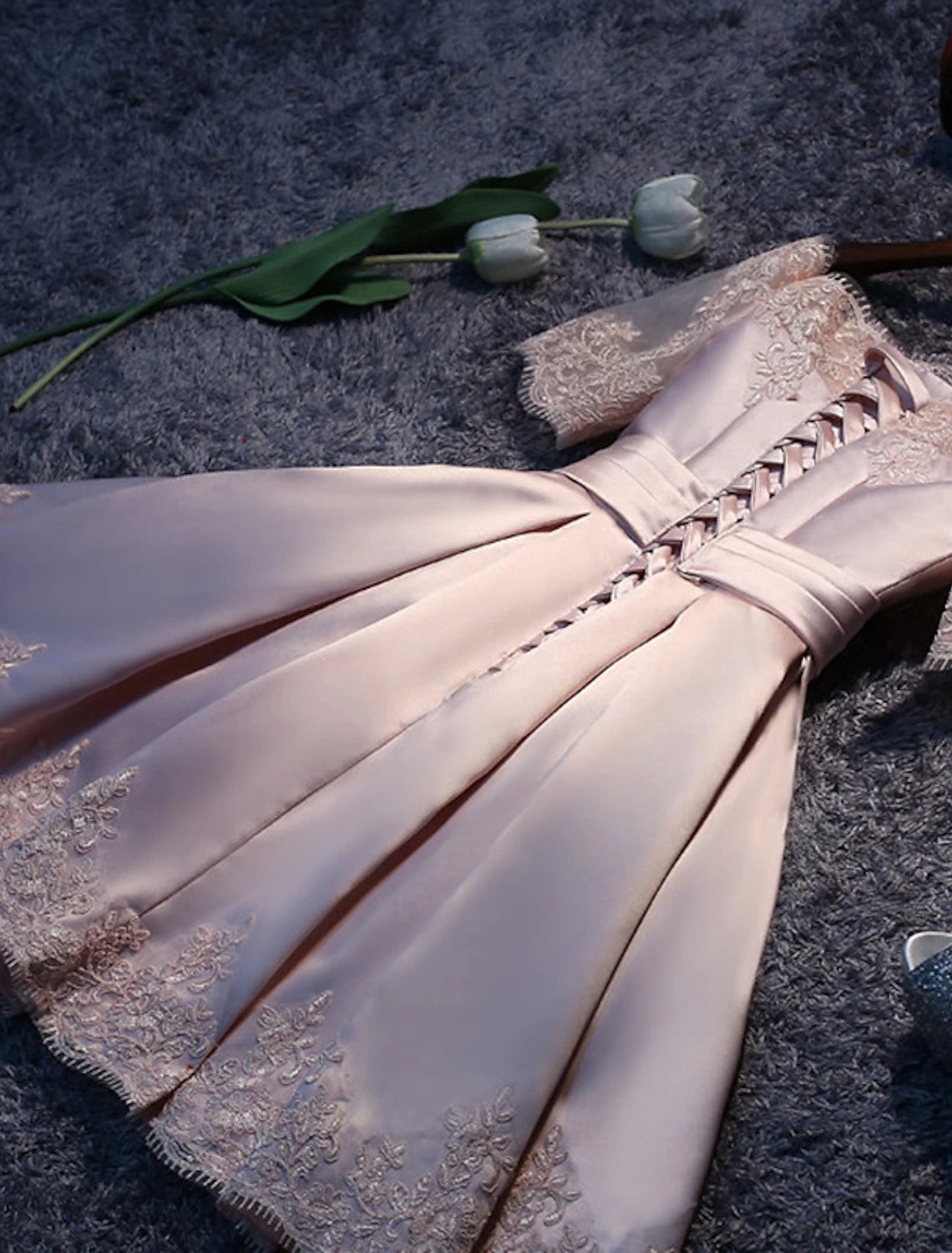 Vestido de dama de honor de corte A, hombros descubiertos, manga corta, elegante, corto/mini, de satén con encaje - Rosa / EE. UU. 2 / Reino Unido 6 / UE 32