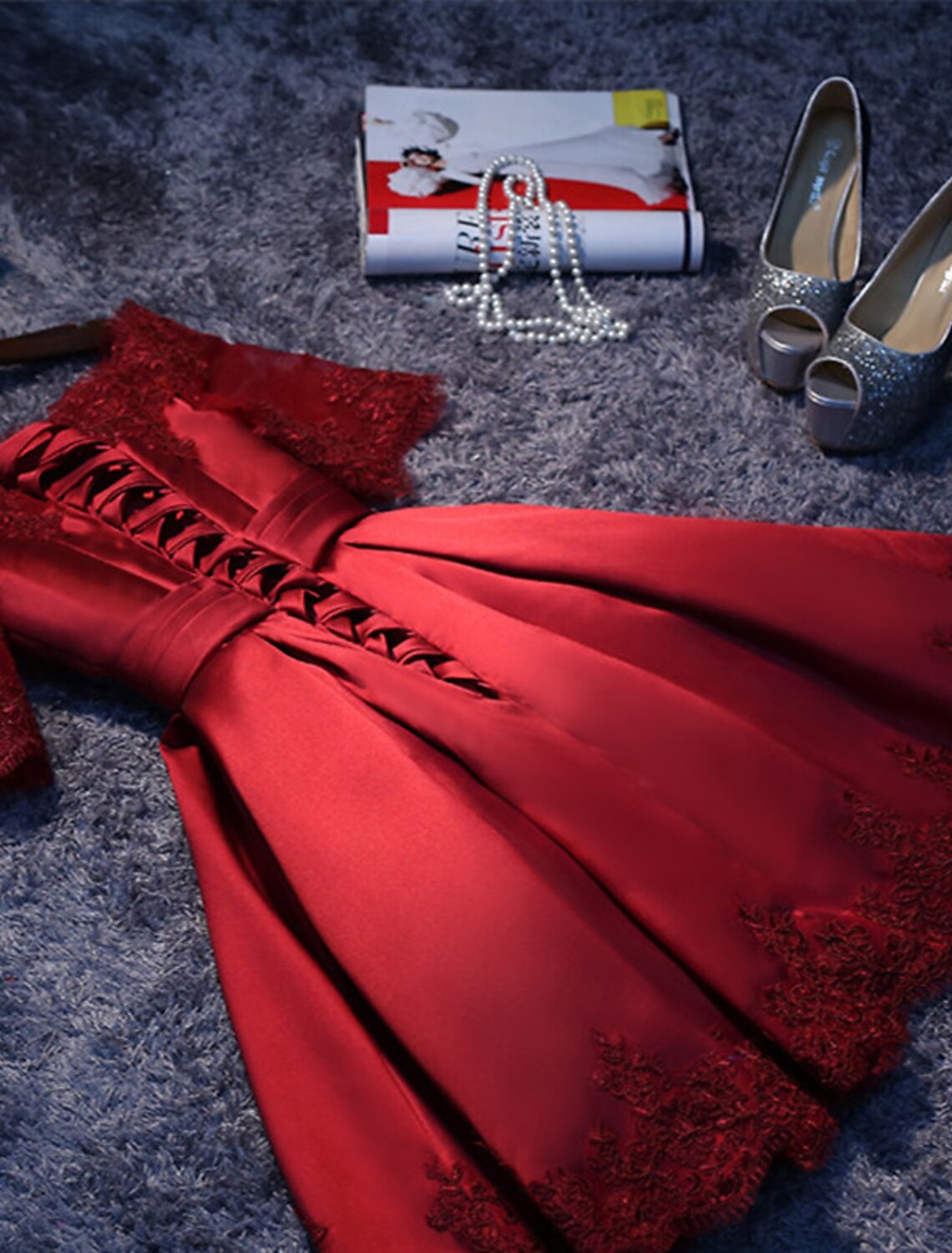 Vestido de dama de honor de corte A, hombros descubiertos, manga corta, elegante, corto/mini, de satén con encaje