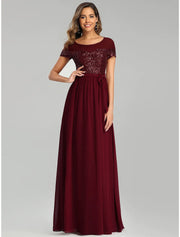 Vestido de dama de honor de corte A, manga corta, elegante, largo hasta el suelo, de gasa, con cinta y lentejuelas