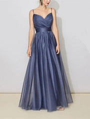 Vestido de dama de honor de corte A, escote en V, sin mangas, elegante, largo hasta el suelo, de tul con fruncido