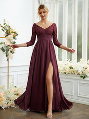 Vestidos de dama de honor de corte A/princesa, de gasa, con encaje, escote en V, mangas largas y largo hasta el suelo