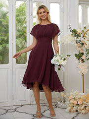 Vestidos de dama de honor asimétricos de corte A/princesa, de gasa, fruncidos, escote redondo y mangas cortas