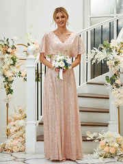 Vestidos de dama de honor de corte A/princesa, fruncidos, escote en V, mangas cortas y largo hasta el suelo