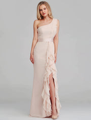Vestido de dama de honor de un solo hombro sin mangas elegante largo de gasa con volantes en cascada