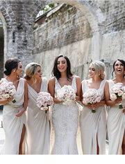 Vestido de dama de honor de sirena/trompeta, escote en V, sin mangas, elegante, cola larga/cortada, de gasa con pliegues, abertura frontal y fruncido.