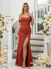 Vestidos de dama de honor de corte tubo/columna, de gasa, fruncidos, hombros descubiertos, sin mangas y hasta el suelo