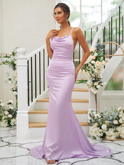 Vestidos de dama de honor con corte tubo/columna, fruncido, cuadrado, sin mangas, con cola larga