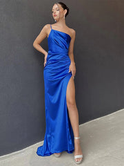 Vestidos de corte tubo/columna de satén tipo seda, fruncidos, con un solo hombro, sin mangas y con cola larga - Azul real