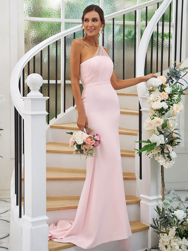 Vestidos de dama de honor con corte tubo/columna, de crepé elástico, fruncido, un hombro, sin mangas, con cola larga