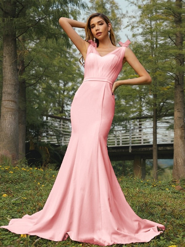 Vestidos de dama de honor de corte trompeta/sirena, de crepé elástico, fruncido, escote en V, sin mangas, con cola larga - Mostrar como imagen