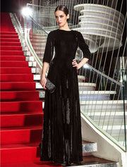 Vestido estilo celebridad de corte A para invitada de boda, largo hasta el suelo, manga de terciopelo con pliegues