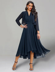Vestido elegante de dos piezas para invitada de boda, corte A, para cóctel, fiesta, largo hasta la rodilla, manga 3/4, escote en V, gasa convertible con chal