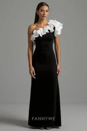 FannyWe - Vestidos de noche sencillos, en blanco y negro, con un solo hombro, vestido formal largo con volantes, gran oferta - EE. UU. 2 / Reino Unido 6 / UE 32