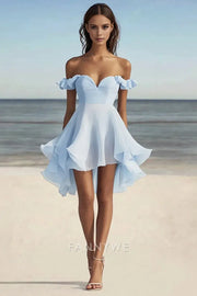 Vestido de graduación elegante FannyWe de gasa azul cielo con escote en forma de corazón, corte A y volantes.