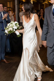 Vestidos de novia de seda con escote en V, espalda abierta, cola larga y abalorios para playa