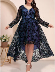Vestido de madre de la novia de corte A, talla grande, con curvas, para invitada de boda, talla grande, elegante, escote en V, asimétrico, largo hasta el tobillo, encaje, manga larga con pliegues