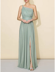 Vestido de dama de honor de corte A, un hombro, sin mangas, elegante, largo hasta el suelo, de tul con abertura frontal y fruncido.
