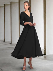 Vestido elegante de gasa para madre de la novia, corte A, escote en V, largo hasta la rodilla, manga 3/4 con pliegues