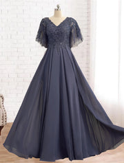 Vestido de madre de la novia de corte A, talla grande, elegante, escote en V, largo hasta el suelo, de gasa, encaje, manga corta con pliegues y apliques de cuentas.