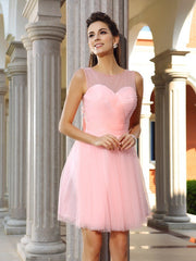 Vestidos de cóctel cortos de satén sin mangas con escote en A/princesa y cuentas