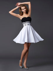 Vestidos de fiesta cortos de gasa con escote corazón, sin mangas y con cuentas, corte A/princesa