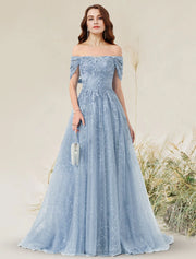 Vestidos de fiesta de corte A, elegantes, para invitados de boda, con cola larga y sin mangas, con hombros descubiertos, encaje y pliegues.