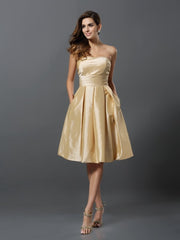 Vestidos de dama de honor de tafetán, corte A, sin tirantes, sin mangas, hasta la rodilla, con volantes