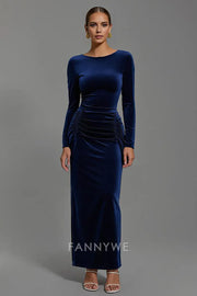 Vestido elegante de fiesta largo con escote barco y mangas de terciopelo azul marino de FannyWe - EE. UU. 2 / Reino Unido 6 / UE 32