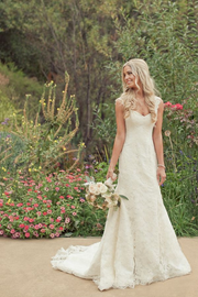 Vestido de novia de sirena sin mangas con escote en V y escote corazón con encaje y cola de cepillo