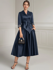Vestido azul marino de corte A para madre de la novia, elegante, de satén, sencillo, cuello camisero, largo hasta la rodilla, manga 3/4 con faja/cinta y abalorios, color liso, 2024