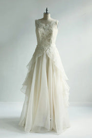 Vestido de fiesta largo de gasa con encaje y cuello redondo