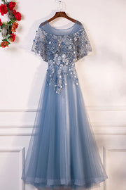 Vestido de fiesta largo de tul con cuello redondo y encaje
