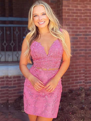 Vestido de dos piezas corto/mini sin mangas con escote en V y apliques de encaje y corte tubo/columna