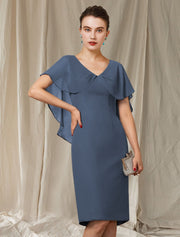 Vestido de madre de la novia con corte tubo/columna, sencillo, elegante, escote en V, largo hasta la rodilla, de gasa, manga corta y volantes