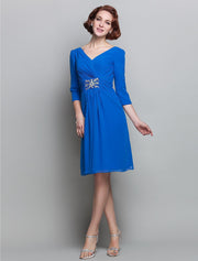 Vestido de madre de la novia con corte tubo/columna, escote en V, largo hasta la rodilla, de gasa, manga 3/4 con cristales fruncidos entrecruzados