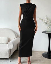 Vestido de noche elegante con escote en V fruncido y sin mangas con abertura en la espalda para invitada de boda