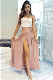 Vestido de noche formal de dos piezas sin tirantes hasta los tobillos con abertura alta de gasa, vestido de fiesta