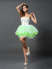 Vestidos de cóctel cortos de organza con corte A/princesa, sin tirantes, con volantes y sin mangas