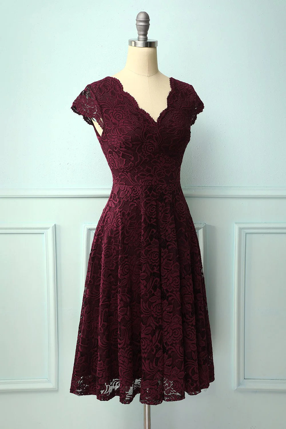 Vestido midi de encaje con cuello en V azul marino - borgoña / EE. UU. 2 / Reino Unido 6 / UE 32
