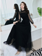 Vestido negro de corte A, elegante vestido de fiesta, vestido de graduación, cuello alto, manga larga, largo hasta el suelo, encaje con volantes