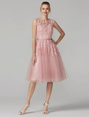 Vestido de cóctel, fiesta, graduación, largo hasta la rodilla, sin mangas, cuello ilusión, tul sobre encaje con apliques de cuentas.