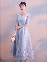 Vestido elegante de cóctel, fiesta y graduación, corte A, escote joya, manga 3/4, largo hasta la rodilla, encaje con aplicación de encaje, estampado/patrón de apliques